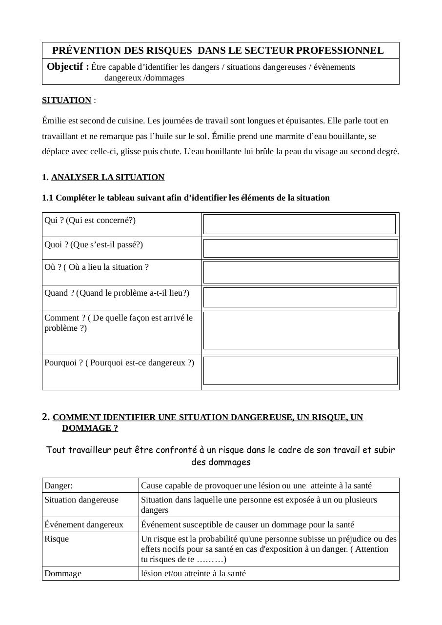 Objectif : Être capable d’identifier les dangers / situations dangereuses / évènements